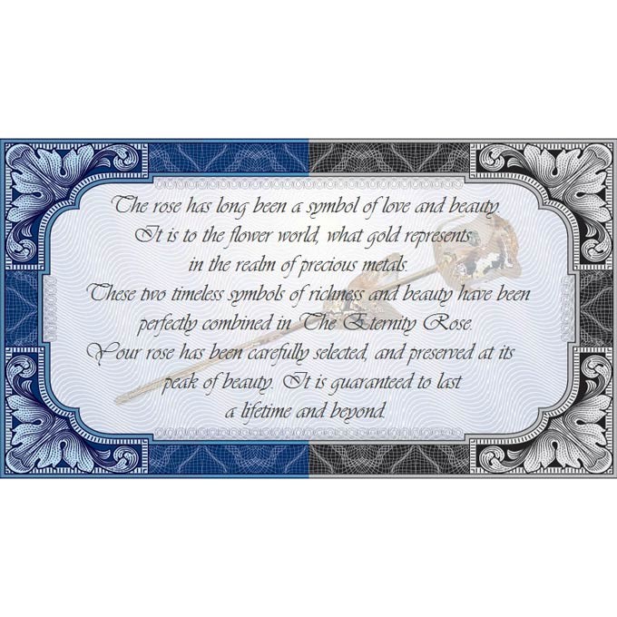 Als altbewährtes Symbol für Liebe, Leidenschaft und Schönheit hat die Rose eine lange Geschichte als die begehrteste aller Blumen. Indem sie Emotionen beschwört und aufrichtige Liebe enthüllt zeigt eine Rose ihre Kraft… und wenn sie mit Gold gepaart wird, wirkt sie noch kräftiger. Sowohl Gold als auch Rosen wurden in der gesamten menschlichen Geschichte immer verehrt und in unserer Literatur und Kunst verewigt. Als zeitlose Symbole der Pracht ist es kein Wunder, dass sich die Kombination dieser beiden Elemente als ein makelloses, perfektes Geschenk eignen. Die "Rose der Ewigkeit” ist ein vergoldetes Meisterwerk, das bis in die Ewigkeit reicht und sich perfekt als einzigartiges Geschenk für eine Frau in Ihrem Leben, die sich darüber ein Leben lang freuen kann, eignet.